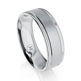 Stylish and contemporary, The Winchester Brushed Grooved Edge Platinum Wedding Ring is bound to impress. This ring is available in Platinum 950 or Platinum 600 and is custom made to order.