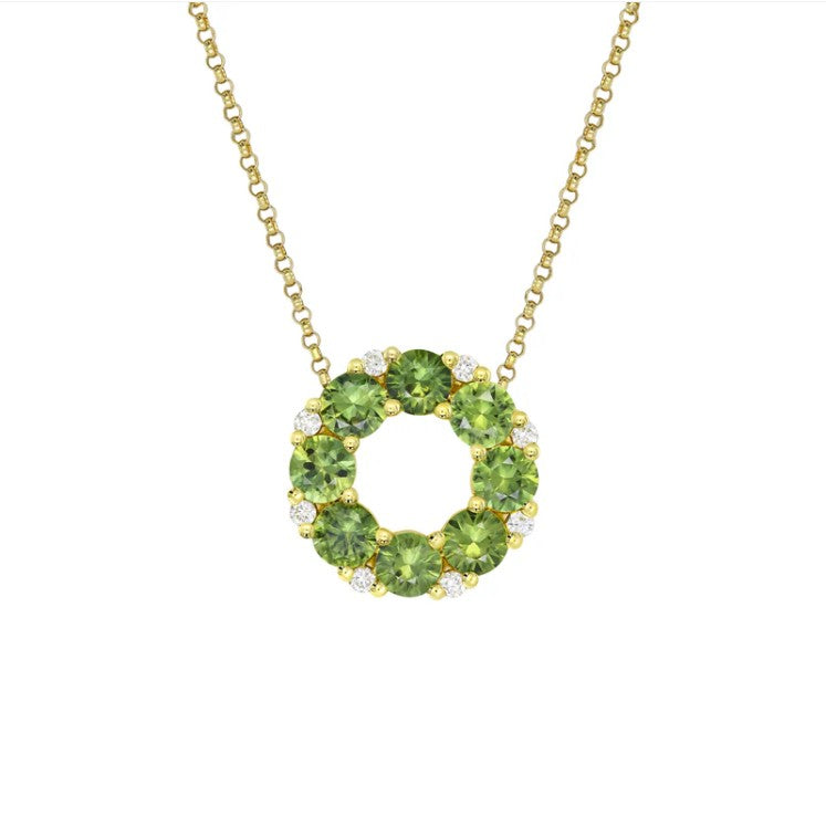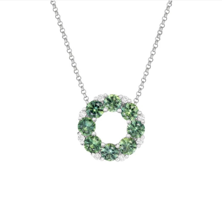 The Coreen Sapphire necklace features a stunning arrangement of Australian sapphires expertly set in a circle and separated between petite white diamonds for that extra sparkle.
