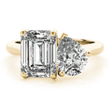 This beautiful Elodie Diamond Engagement Ring is a Toi et Moi setting, symbolising "you and me" and the coming together of two diamonds or gemstones of your choosing. As pictured, this ring is shown with an emerald and pear diamond, however can be customised for any shape and carat weight you require. The setting price is for the ring mount itself, and does not include the two diamonds or gemstones which are available separately for purchase.