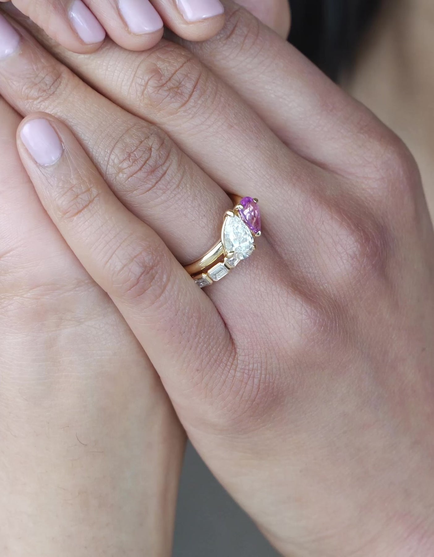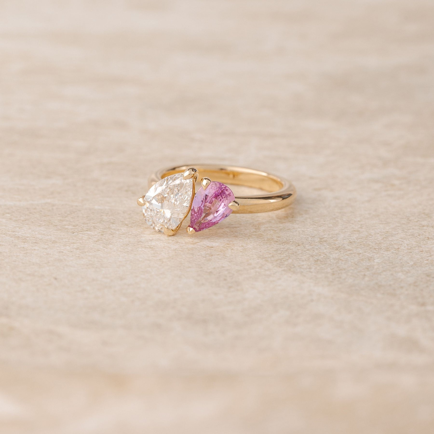 Our stunning Lara Toi et Moi Ring features a Pink / Purple 1.10 ct Sapphire and 1.51 ct Pear Lab Diamond.