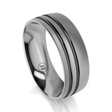The Offset Dual Grooved Black and Grey Zirconium Wedding Ring adds a stylish addition to a classic ring.