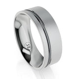 Stylish, Rugged and Masculine Offset Gold Wedding Ring with Tantalum Stripe band is available in both 9 and 18 ct gold options.