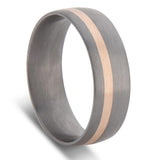 Stylish, Rugged and Masculine this impressive Tantalum and Rose Gold Inlay Wedding Ring is available in both 9 and 18 ct gold options.