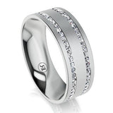 Stylish and contemporary, the impressive looking Archibald White Gold Band features two rows of white diamonds around the centre of the band (approx 100 stones X .01ct, dependent on ring size). This ring is made to order and available in 9 or 18 carat Gold options.