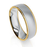 Stylish and contemporary, The Ashton is an impressive ring features a slightly raised Brushed Platinum centre with your choice of polished gold edges, showcasing a stylish looking ring.