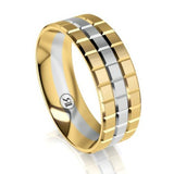 Stylish and contemporary, the great looking Aspen Two Tone Yellow & White Gold Notched Wedding Ring features multiple faceted grooves revealing a stylish look. This wedding ring is made to order and available in 9 or 18 Carat Gold options.