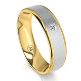 Stylish and contemporary, the impressive looking Astley Two-Tone Gold Ring (with White Gold Inner) features a single diamond in the centre of the band (.05ct - 2.3mm). This ring is made to order and available in 9 or 18 carat Gold options.