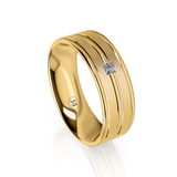 Stylish and contemporary, the impressive looking Barrington Gold ring features a 0.07ct diamond in the centre of the band (.07ct - 2.2mm). This ring is made to order and available in 9 or 18 carat Yellow and Rose Gold options.