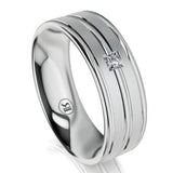 Stylish and contemporary, the impressive looking Barrington White Gold ring features a 0.07ct diamond in the centre of the band (.07ct - 2.2mm). This ring is made to order and available in 9 or 18 carat Gold options.
