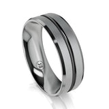 The Grey Zirconium and Black Zirconium Grooved Bevelled Edge Wedding Ring adds a stylish addition to a classic ring.