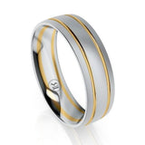 Stylish and contemporary, The Lexington Platinum & Gold Wedding Ring is impressive! Featuring brushed platinum with your choice of gold in the double groove strip, showcasing a stylish looking ring.