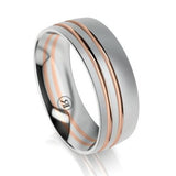 Stylish and contemporary, the impressive looking Ludlow White Gold & Rose Gold Offset Grooved Wedding Ring features a stylish offset double grooved pattern around the ring. This Wedding Ring is made to order.