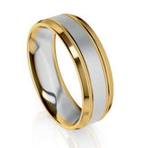The stylish and contemporary The Preston Two Tone Gold Edge Bevelled Wedding Ring features a modern gold edge and brushed white gold middle. As pictured, this ring is 7 mm wide.
