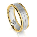 Stylish and contemporary, the impressive looking Theodore Yellow and White Gold Men's Wedding Ring features a dual groove pattern. This Wedding Ring is made to order and available in 9 or 18 carat Gold options.