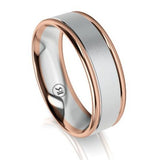 Stylish and contemporary, this impressive looking Wedding Ring features Rose Gold and White Gold Centre. This Wedding Ring is made to order and available in 9 or 18 carat Gold options.